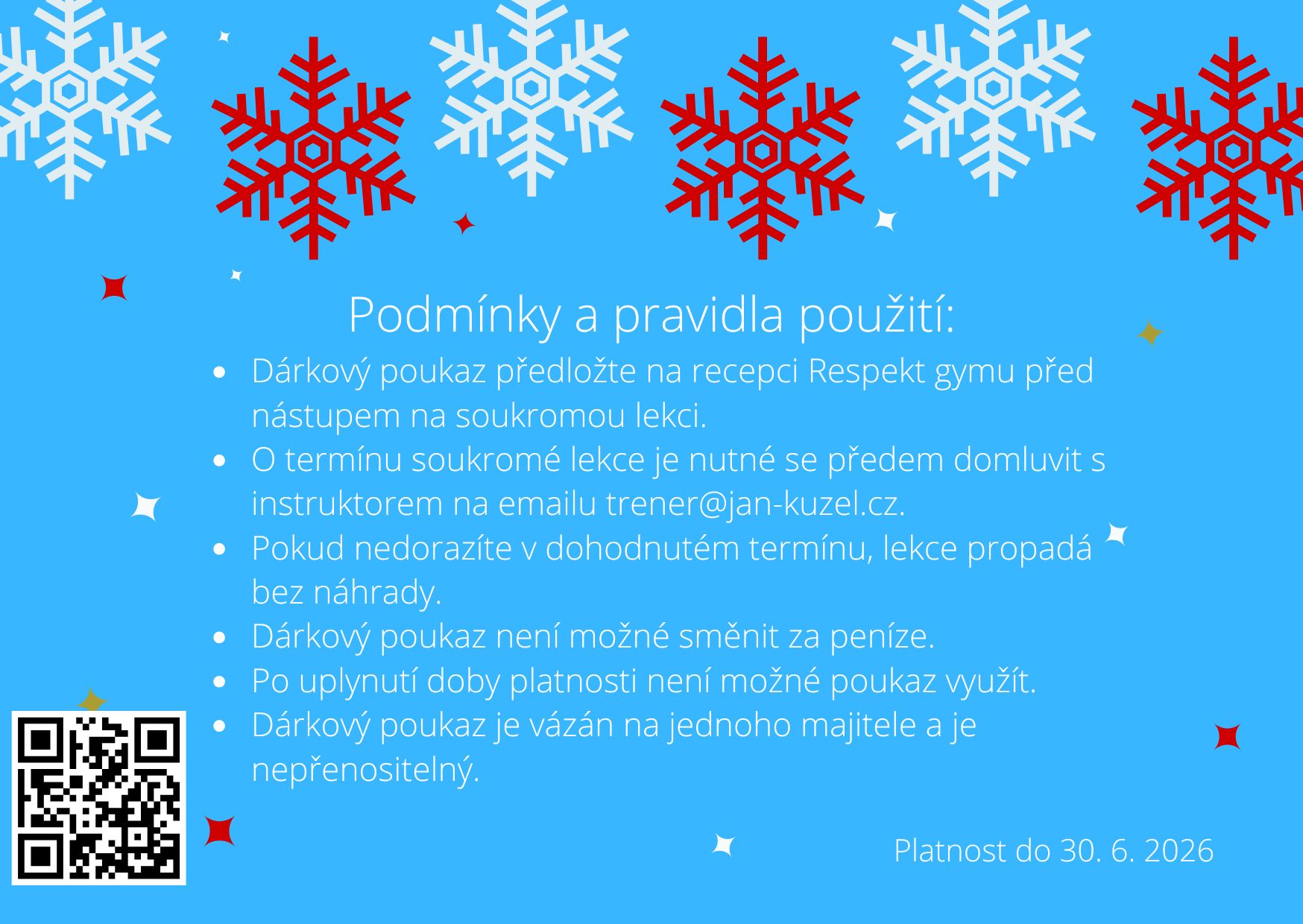 - Dárkový poukaz předložte na recepci Respekt gymu před nástupem na soukromou lekci.